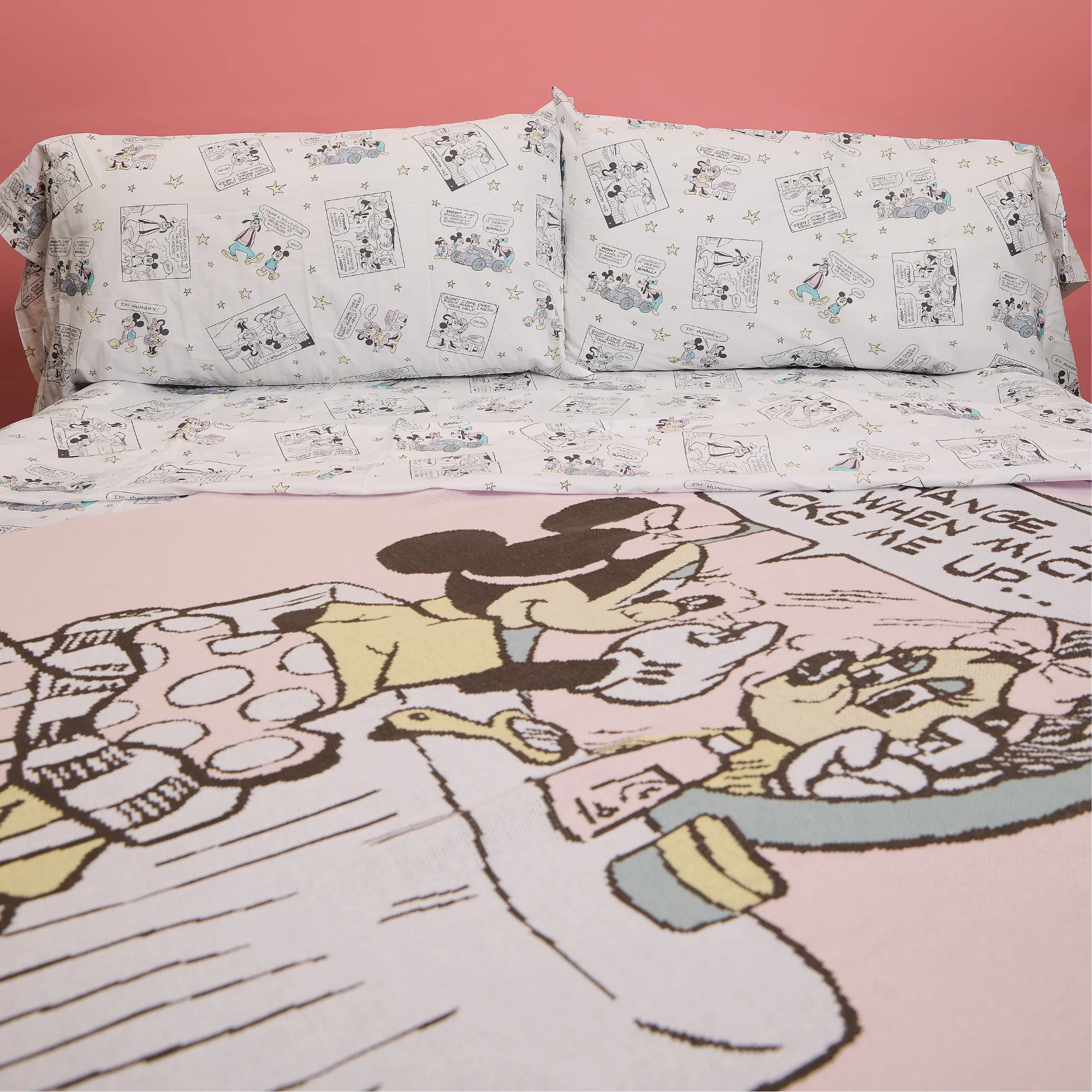 These cozy, yet breathable, Disney’s Mickey Mouse and Friends Comic Sheet Set features an all-over print of a pastel, comic print featuring Mickey Mouse, Minnie Mouse, and Goofy. Available in Full, Queen, and King.